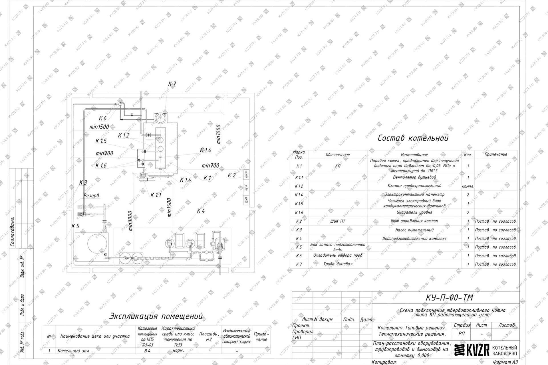 Чтобы правильно подключить дровяной паровой котел 1000 кг / 1 т пара -115 °С -0,07 МПа / 0,7 кгс/cм² в котельной необходимо оставить проемы для обслуживания оборудования во время эксплуатации. На представленной здесь схеме обозначены их размеры. Кроме того, в данной примерной схеме монтажа паровых котлов и оборудования указан перечень минимально необходимого вспомогательного оборудования.