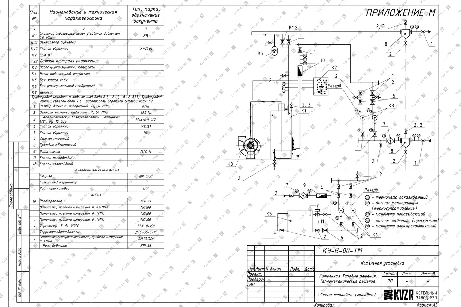 Образец тепловой схемы подключения котла 0.25 МВт уголь дрова и вспомогательного оборудования в котельной приведен на данной схеме. При эксплуатации очень важно грамотно осуществить подключение оборудования, установить все контрольно измерительные приборы, для контроля параметров работы котельной и запорную арматуру для оперативного переключения потока теплоносителя при плановой или аварийной остановке оборудования. Данную схему можно использовать как пример для разработки под свой объект или заказать у нас разработку индивидуальной схемы для вашей котельной.