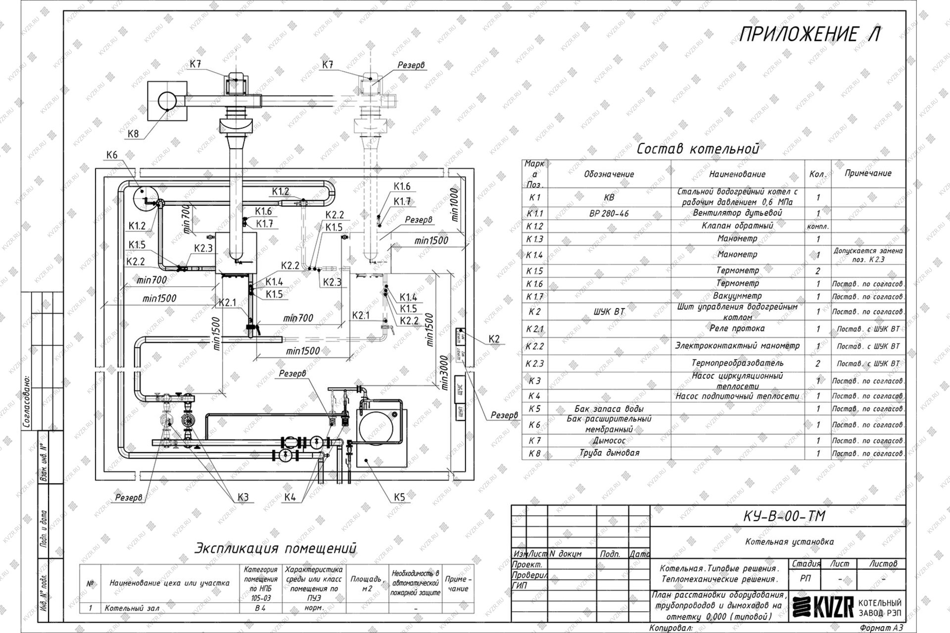 Чтобы правильно подключить котел 0.25 МВт уголь дрова в котельной необходимо оставить проемы для обслуживания оборудования во время эксплуатации. На представленной здесь схеме указаны их минимальные размеры. Кроме того, в данной примерной схеме монтажа водогрейных котлов и оборудования указан перечень минимально необходимого вспомогательного оборудования для правильной работы котла.