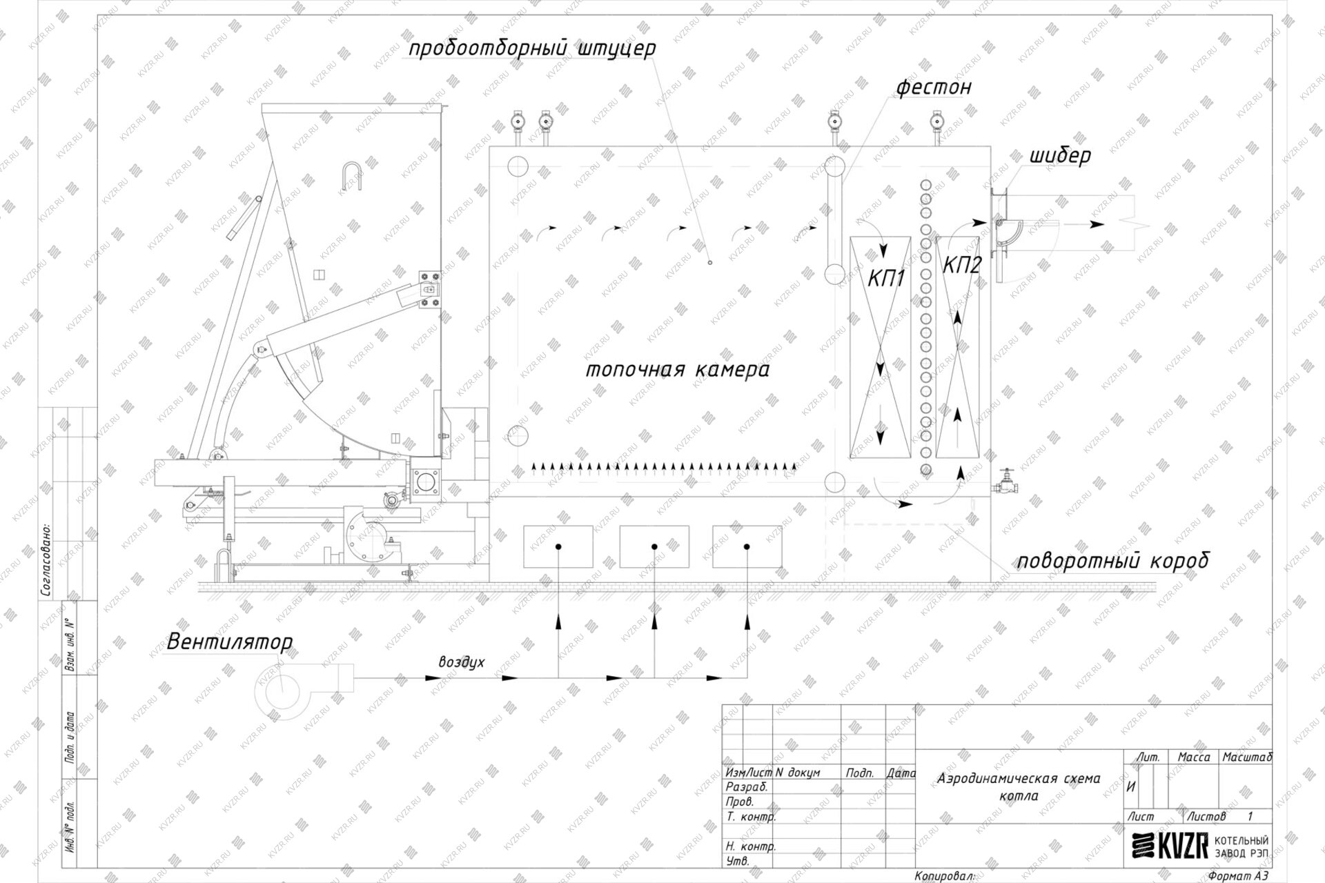 Воздух в механический водогрейный котел КВм-1.6 с ТШПМ подается вентилятором поддува через топочный короб под слой твердого топлива для обеспечения горения. На боковой панели топки котла имеется пробоотборочный штуцер для подключения манометра и тягонапорометра.